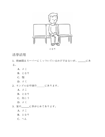 となり 活学活用 1.映画館はスーパーにくっついているわけではないが、______にあ る。 A.よこ B.となり C.側 D.よく 2.モンゴルは中国の______にあります。 A.よこ B.となり C.向こう D.よく 3.家の______に車がとめてあります。 A.よこ B.となり C.へん