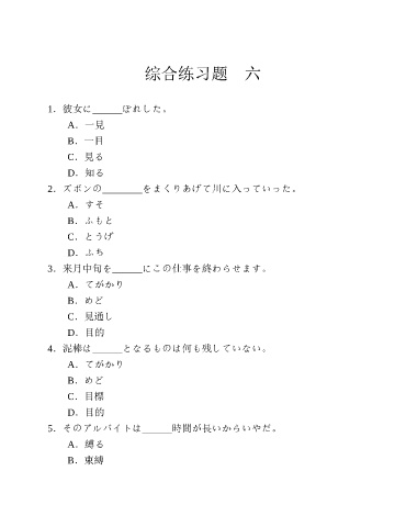 综合练习题 六 1.彼女に______ぼれした。 A.一見 B.一目 C.見る D.知る 2.ズボンの________をまくりあげて川に入っていった。 A.すそ B.ふもと C.とうげ D.ふち 3.来月中旬を______にこの仕事を終わらせます。 A.てがかり B.めど C.見通し D.目的 4.泥棒は______となるものは何も残していない。 A.てがかり B.めど C.目標 D.目的 5.そのアルバイトは______時間が長いからいやだ。 A.縛る B.束縛