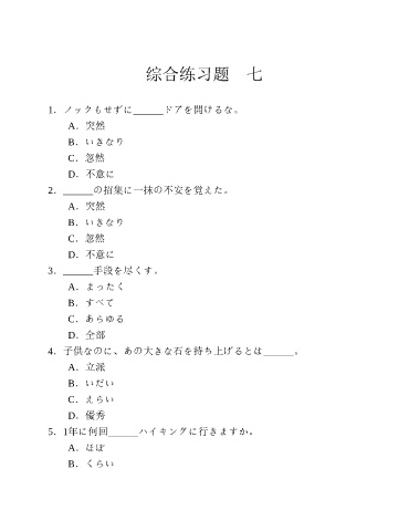 综合练习题 七 1.ノックもせずに______ドアを開けるな。 A.突然 B.いきなり C.忽然 D.不意に 2.______の招集に一抹の不安を覚えた。 A.突然 B.いきなり C.忽然 D.不意に 3.______手段を尽くす。 A.まったく B.すべて C.あらゆる D.全部 4.子供なのに、あの大きな石を持ち上げるとは______。 A.立派 B.いだい C.えらい D.優秀 5.1年に何回______ハイキングに行きますか。 A.ほぼ B.くらい