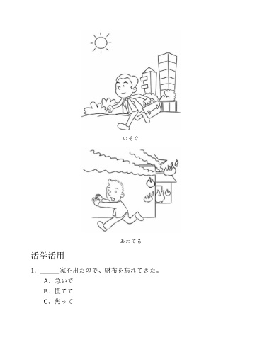 いそぐ あわてる 活学活用 1.______家を出たので、財布を忘れてきた。 A.急いで B.慌てて C.焦って
