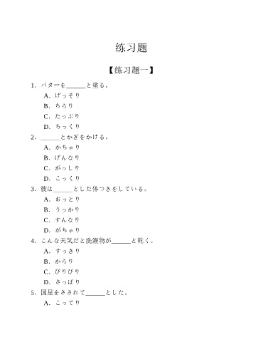 练习题 【练习题一】 1.バターを______と塗る。 A.げっそり B.ちらり C.たっぷり D.ちっくり 2.______とかぎをかける。 A.かちゃり B.げんなり C.がっしり D.こっくり 3.彼は______とした体つきをしている。 A.おっとり B.うっかり C.すんなり D.がちゃり 4.こんな天気だと洗濯物が______と乾く。 A.すっきり B.からり C.ぴりぴり D.さっぱり 5.図星をさされて______とした。 A.こってり
