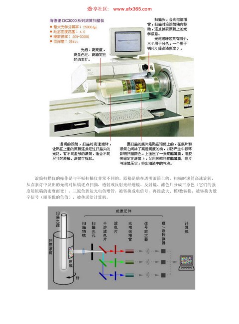 扫描仪的结构和原理 ιٳཚഠ XXX BGY DPN 页码,3/4 滚筒扫描仪的操作是与平板扫描仪非常不同的。原稿是贴在透明滚筒上的,扫描时滚筒高速旋转, 从卤素灯中发出的光线对原稿逐点扫描,透射或反射光经透镜、反射镜、滤色片分成三原色(它们的强 度随原稿的密度而变),三原色到达光电倍增管,被转换成电信号,再经放大、模/数转换,被转换为数 字信号(即图像的色值),被传送给计算机。 https://www.antssoft.com/4-3.htm 2009-5-9
