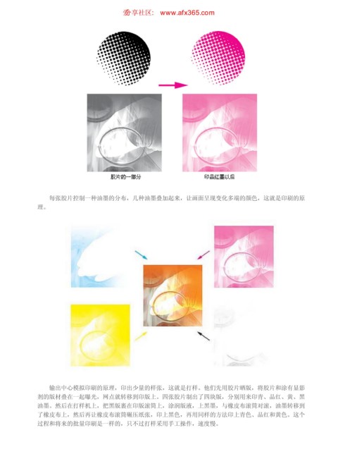 剂的版材叠在一起曝光,网点就转移到印版上。四张胶片制出了四块版,分别用来印青、品红、黄、黑