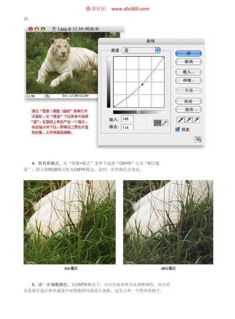 原稿处理过程综述 ιٳཚഠ XXX BGY DPN 页码,3/7 调。 4、转色彩模式。从“图像>模式”菜单下选择“CMYK”以及“8位/通 道”,即可将RGB模式转为CMYK模式,这时,有些颜色会变灰。 5、进一步调整颜色。在CMYK模式下,可以有很多种方法调整颜色,而且时 常需要在选区和单通道中对图像的局部进行调整。这里只举一个简单的例子。 https://www.antssoft.com/5-8.htm 2009-5-9