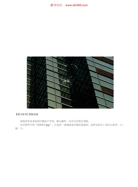 修补图像 ιٳཚഠ XXX BGY DPN 页码,7/9 【练习5-7】消除杂线 杂线常常是老化的扫描仪产生的,耐心操作,完全可以将它消除。 打开附件中的“材料5-7.jpg”,左边有一条细线是扫描仪造成的,怎样去掉它?请自己思考一下, 做一下。 https://www.antssoft.com/5-12.htm 2009-5-9