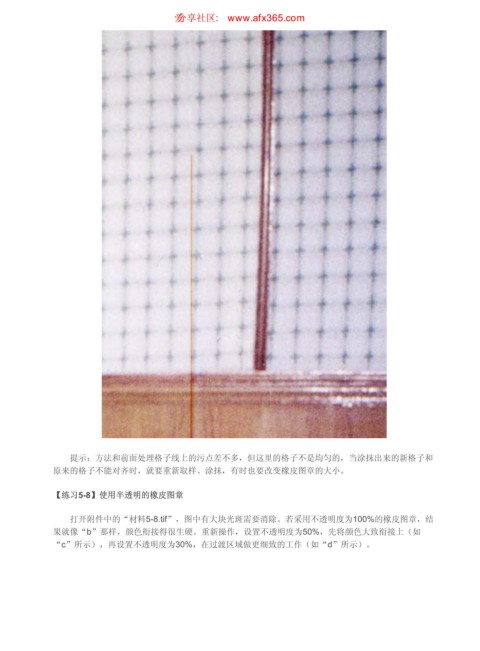 原来的格子不能对齐时,就要重新取样、涂抹,有时也要改变橡皮图章的大小。