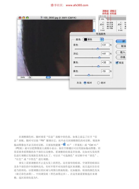 色进行调整后发现肤色变得太红了,可以在“可选颜色”对话框中对“黄色”、