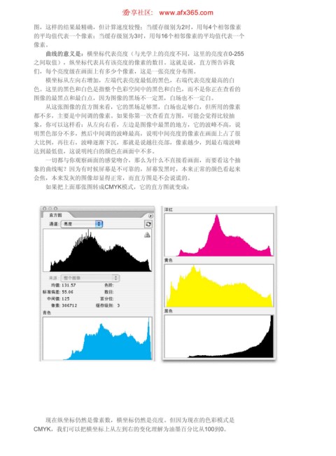 如果把上面那张图转成CMYK模式,它的直方图就变成:
