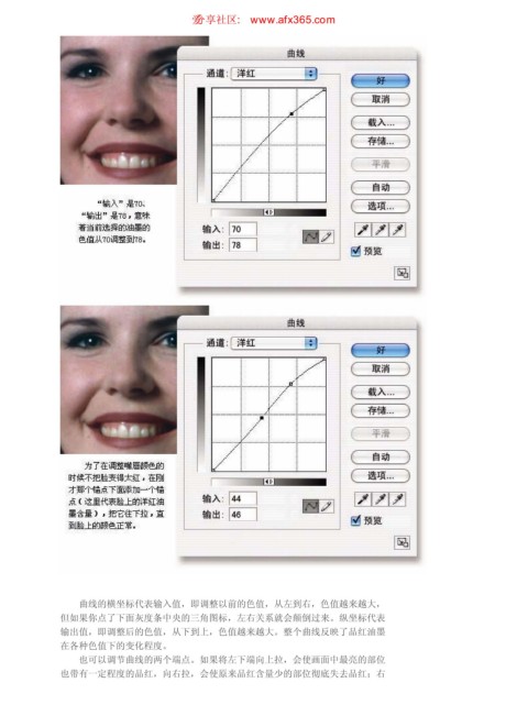 输出值,即调整后的色值,从下到上,色值越来越大。整个曲线反映了品红油墨