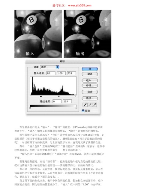 图中,“输入色阶”左端的60对应于“输出色阶”左端的0,这表示,原图中