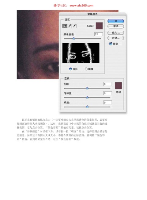 在“替换颜色”对话框下方,试着拉一拉“明度”滑块,选择范围会显示得