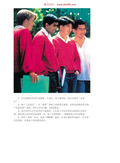 1、首先围绕所有的红衣服做一个选区,适当地羽化,把它存储为“总选