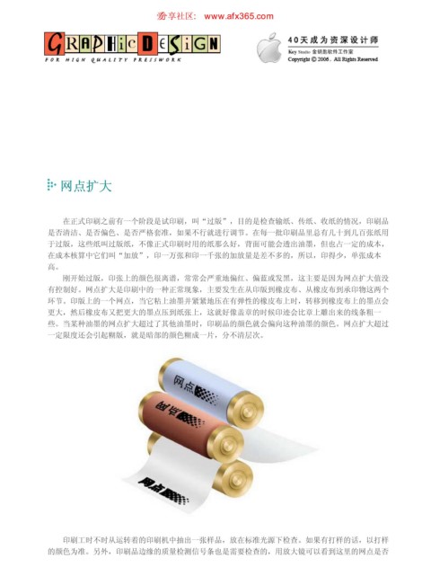 环节。印版上的一个网点,当它粘上油墨并紧紧地压在有弹性的橡皮布上时,转移到橡皮布上的墨点会