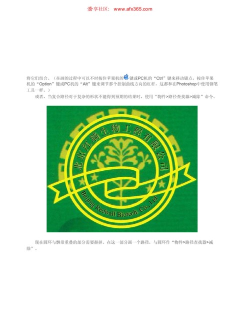 现在圆环与飘带重叠的部分需要抠掉。在这一部分画一个路径,与圆环作“物件>路径查找器>减