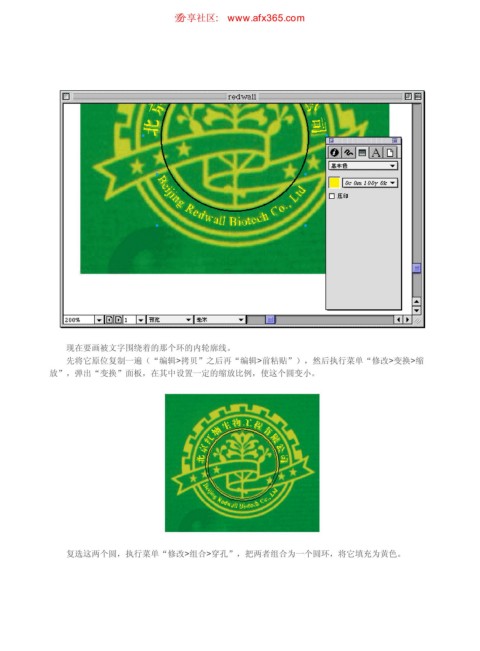用Freehand描绘矢量图 ιٳཚഠ XXX BGY DPN 页码,5/7 现在要画被文字围绕着的那个环的内轮廓线。 先将它原位复制一遍(“编辑>拷贝”之后再“编辑>前粘贴”),然后执行菜单“修改>变换>缩 放”,弹出“变换”面板,在其中设置一定的缩放比例,使这个圆变小。 复选这两个圆,执行菜单“修改>组合>穿孔”,把两者组合为一个圆环,将它填充为黄色。 https://www.antssoft.com/7-2.htm 2009-5-9