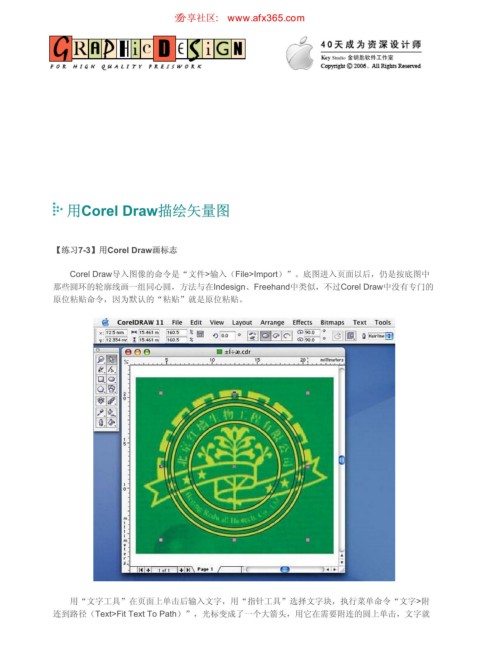 连到路径(Text>Fit Text To Path)”,光标变成了一个大箭头,用它在需要附连的圆上单击,文字就