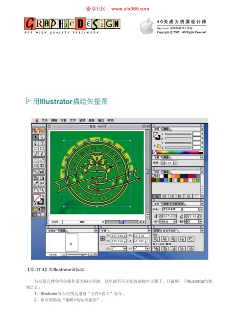 用Illustrator描绘矢量图 ιٳཚഠ XXX BGY DPN 页码,1/2 用Illustrator描绘矢量图 【练习7-4】用Illustrator画标志 与前面几种软件的操作是大同小异的,这里就不再详细叙述操作步骤了,只说明一下Illustrator的特 别之处: 1、Illustrator导入位图是通过“文件>置入”命令。 2、原位粘贴是“编辑>粘贴到前面”。 https://www.antssoft.com/7-4.htm 2009-5-9