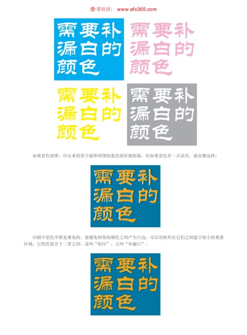 陷印(补漏白) ιٳཚഠ XXX BGY DPN 页码,2/5 如果套色很准,印出来的黄字就和周围的蓝色很好地衔接,但如果套色有一点误差,就会像这样: 印刷中套色不准是难免的,要避免相邻的颜色之间产生白边,可以用软件在它们之间建立很小的重叠 区域,它的色值介于二者之间,这叫“陷印”,又叫“补漏白”。 https://www.antssoft.com/7-9.htm 2009-5-9