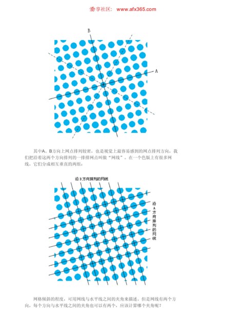网线和网角 ιٳཚഠ XXX BGY DPN 页码,2/4 其中A、B方向上网点排列较密,也是视觉上最容易感到的网点排列方向,我 们把沿着这两个方向排列的一排排网点叫做“网线”。在一个色版上有很多网 线,它们分成相互垂直的两组: 网格倾斜的程度,可用网线与水平线之间的夹角来描述。但是网线有两个方 向,每个方向与水平线之间的夹角也可以有两个,应该计算哪个夹角呢? https://www.antssoft.com/8-2.htm 2009-5-9