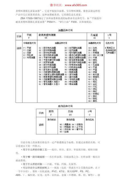 ZBA 17005-1987规定了各种油墨和助剂的标准命名法和代号,如“平版胶印