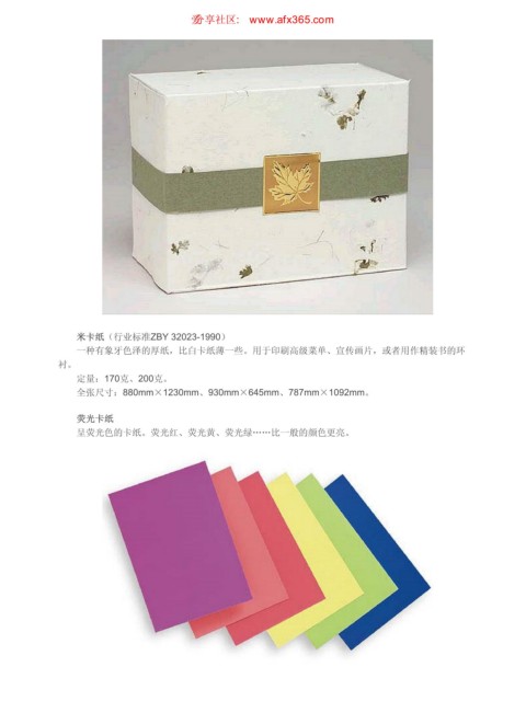 纸的类型 ιٳཚഠ XXX BGY DPN 页码,10/22 米卡纸(行业标准ZBY 32023-1990) 一种有象牙色泽的厚纸,比白卡纸薄一些。用于印刷高级菜单、宣传画片,或者用作精装书的环 衬。 定量:170克、200克。 全张尺寸:880mm×1230mm、930mm×645mm、787mm×1092mm。 荧光卡纸 呈荧光色的卡纸。荧光红、荧光黄、荧光绿……比一般的颜色更亮。 https://www.antssoft.com/10-5.htm 2009-5-9