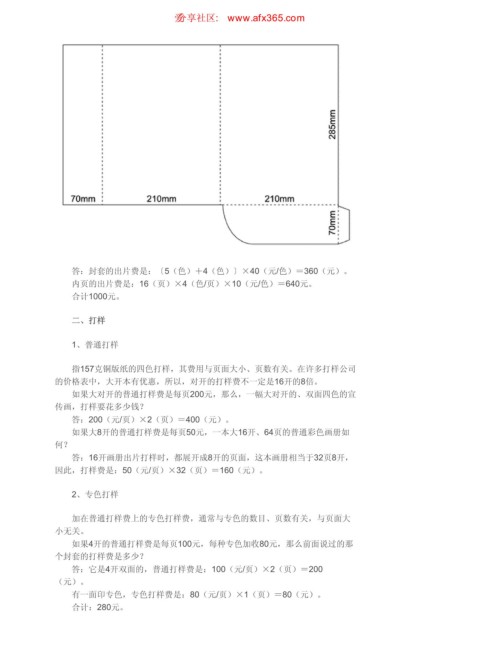 答:它是4开双面的,普通打样费是:100(元/页)×2(页)=200