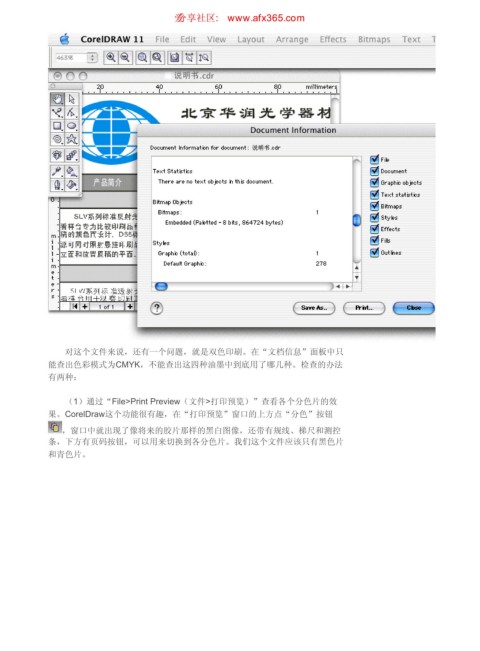 对这个文件来说,还有一个问题,就是双色印刷。在“文档信息”面板中只