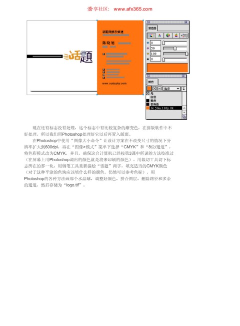 志所在的那一块,用钢笔工具重新描绘“话题”两字,填充适当的CMYK颜色
