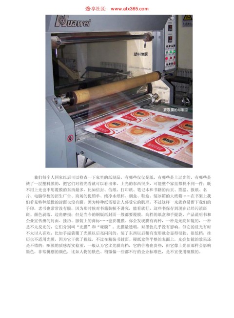 企业宣传册的封面、挂历、服装上的商标……也要覆膜。你会发现膜有两种,一种是光亮如镜的,一种