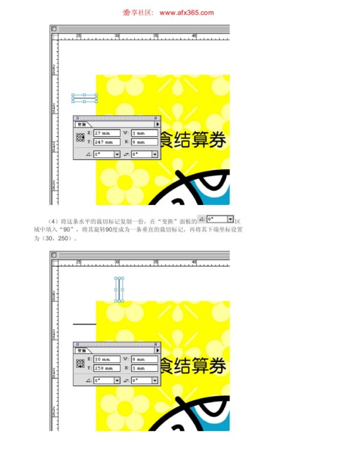 双面单页 ιٳཚഠ XXX BGY DPN 页码,5/12 (4)将这条水平的裁切标记复制一份,在“变换”面板的 区 域中填入“90”,将其旋转90度成为一条垂直的裁切标记,再将其下端坐标设置 为(30,250)。 https://www.antssoft.com/11-3.htm 2009-5-9