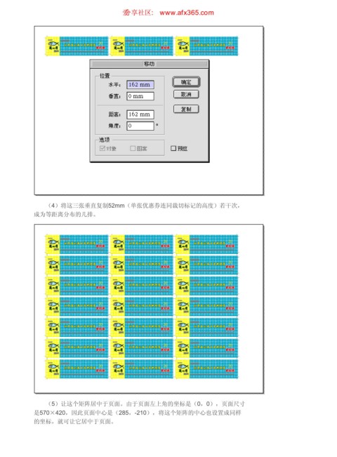 双面单页 ιٳཚഠ XXX BGY DPN 页码,9/12 (4)将这三张垂直复制52mm(单张优惠券连同裁切标记的高度)若干次, 成为等距离分布的几排。 (5)让这个矩阵居中于页面。由于页面左上角的坐标是(0,0),页面尺寸 是570×420,因此页面中心是(285,-210),将这个矩阵的中心也设置成同样 的坐标,就可让它居中于页面。 https://www.antssoft.com/11-3.htm 2009-5-9