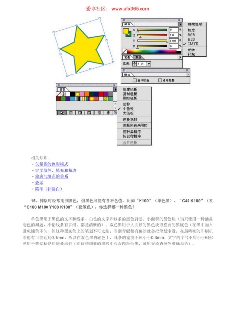 15、排版时经常用到黑色,但黑色可能有各种色值,比如“K100”(单色黑)、“C40 K100”(双色