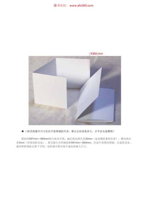 三折页 ιٳཚഠ XXX BGY DPN 页码,3/4 ● 三折页的展开尺寸往往不是常规的开本,那么它应该是多大,才不会太浪费纸? 假如用597mm×889mm的大度对开纸,减去纵向两头各20mm(这是测控条的位置)、横向两头 各3mm(用来切掉毛边),算出最大可印刷面积591mm×849mm,在这个范围内拼版,注意给出血、 裁切和折叠标记留下空间,这样就可算出每个成品的最大尺寸。 https://www.antssoft.com/12-2.htm 2009-5-9