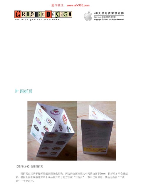 四折页 ιٳཚഠ XXX BGY DPN 页码,1/2 四折页 【练习12-3】设计四折页 四折页由三条平行折线把页面分成四块,两边的块面应该比中间的块面窄3mm,折好后才不会翘起 来。根据全张纸规格计算单个成品展开尺寸的方法在“三折页”一节中已经讲过。其他方面在“二折 页”一节中讲过。 https://www.antssoft.com/12-3.htm 2009-5-9