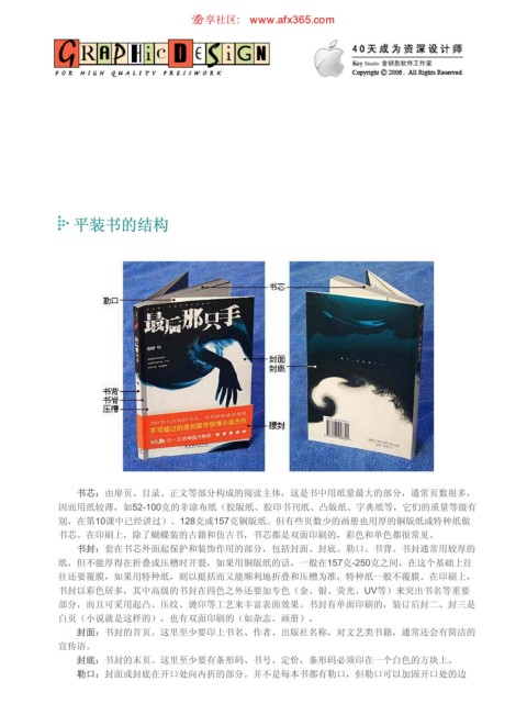 部分,而且可采用起凸、压纹、烫印等工艺来丰富表面效果。书封有单面印刷的,装订后封二、封三是