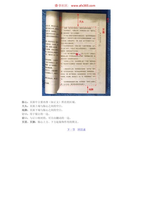 平装书的结构 ιٳཚഠ XXX BGY DPN 页码,4/4 版心:页面中主要内容(如正文)所在的区域。 天头:页面上端与版心之间的空白。 地脚:页面下端与版心之间的空白。 订口:用于装订的一边。 前口:与订口相对的、可自由翻动的一边。 页眉、页脚:版心上方、下方起装饰作用的图文。 下一节 回目录 https://www.antssoft.com/14-1.htm 2009-5-9