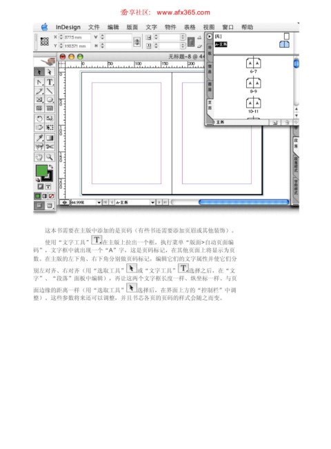 使用“文字工具” 在主版上拉出一个框,执行菜单“版面>自动页面编