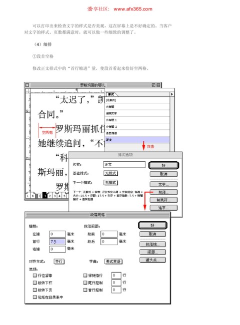 设计精装书 ιٳཚഠ XXX BGY DPN 页码,17/31 可以打印出来检查文字的样式是否美观,这在屏幕上是不好确定的。当客户 对文字的样式、页数都满意时,就可以做一些细致的调整了。 (4)细排 ①段首空格 修改正文排式中的“首行缩进”量,使段首看起来恰好空两格。 https://www.antssoft.com/14-7.htm 2009-5-9