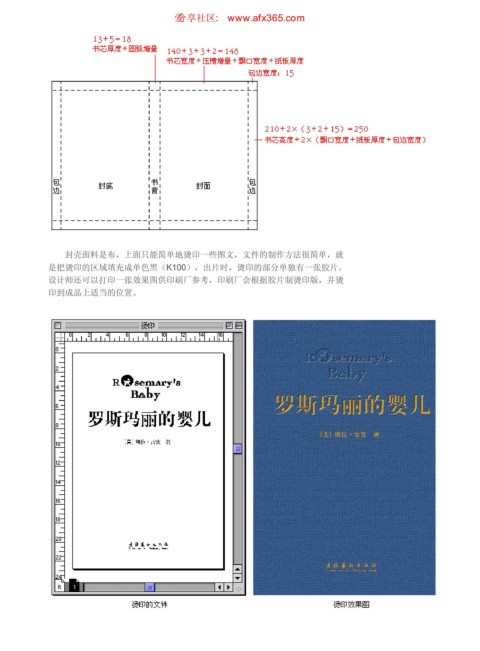 设计精装书 ιٳཚഠ XXX BGY DPN 页码,30/31 封壳面料是布,上面只能简单地烫印一些图文,文件的制作方法很简单,就 是把烫印的区域填充成单色黑(K100),出片时,烫印的部分单独有一张胶片。 设计师还可以打印一张效果图供印刷厂参考,印刷厂会根据胶片制烫印版,并烫 印到成品上适当的位置。 https://www.antssoft.com/14-7.htm 2009-5-9