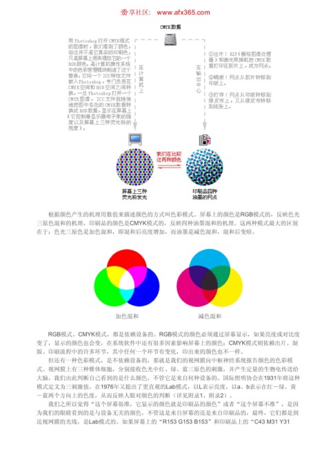 三原色混和的机理,印刷品的颜色是CMYK模式的,反映四种油墨混和的机理。这两种模式最大的区别