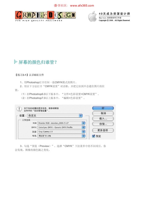 (1)在Photoshop6.0以下版本中,“文件>色彩设置>CMYK设置”。
