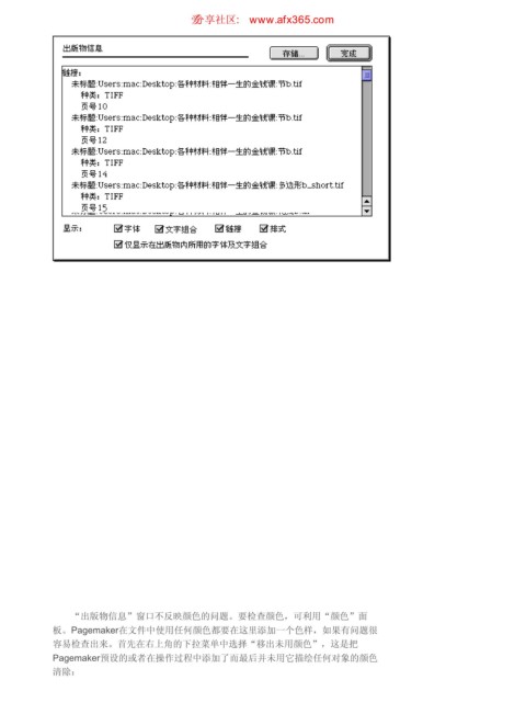 文件检查 ιٳཚഠ XXX BGY DPN 页码,18/42 “出版物信息”窗口不反映颜色的问题。要检查颜色,可利用“颜色”面 板。Pagemaker在文件中使用任何颜色都要在这里添加一个色样,如果有问题很 容易检查出来。首先在右上角的下拉菜单中选择“移出未用颜色”,这是把 Pagemaker预设的或者在操作过程中添加了而最后并未用它描绘任何对象的颜色 清除: https://www.antssoft.com/17-3.htm 2009-5-9