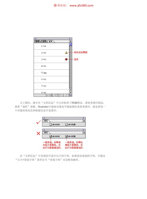 文件检查 ιٳཚഠ XXX BGY DPN 页码,24/42 关于颜色,刚才在“文档信息”中已经检查了RGB错误,要检查叠印情况, 则看“属性”面板。Illustrator只能按对象而不能按颜色来检查叠印,就是看每一 个对象的填充色和轮廓色是不是叠印。 在“文档信息”中发现的不适合出片的字体,如果要改成别的字体,可通过 “文字>查找字体”菜单打开“查找字体”对话框来操作。 https://www.antssoft.com/17-3.htm 2009-5-9
