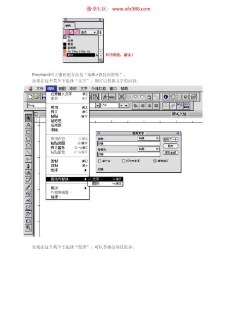 文件检查 ιٳཚഠ XXX BGY DPN 页码,31/42 Freehand纠正错误的方法是“编辑>查找和替换”。 如果在这个菜单下选择“文字”,则可以替换文字的内容。 如果在这个菜单下选择“图形”,可以替换的项目很多。 https://www.antssoft.com/17-3.htm 2009-5-9