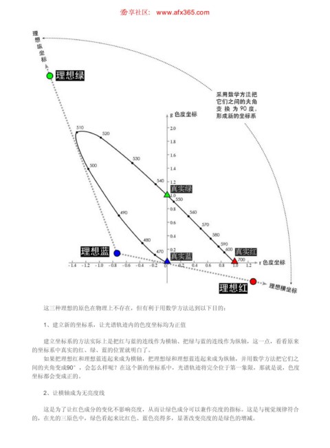 如果把理想红和理想蓝连起来成为横轴,把理想绿和理想蓝连起来成为纵轴,并用数学方法把它们之