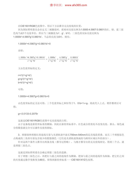 在CIE1931RGB色度图中,用以下方法推导无亮度线的位置: