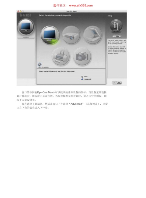 使用专业仪器校准显示器 ιٳཚഠ XXX BGY DPN 页码,3/14 窗口的中间有Eye-One Match可以校准的几种设备的图标,当设备正常连接 到计算机时,图标就不是灰色的。当你要校准某种设备时,就点击它的图标,图 标下方就发绿光。 现在选择了显示器,然后在窗口下方选择“Advanced”(高级模式),点窗 口右下角的箭头进入下一步。 https://www.antssoft.com/3-6.htm 2009-5-9