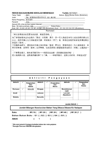 REKOD BACAAN MURID SEKOLAH MENENGAH Tarikh:18/7/2021