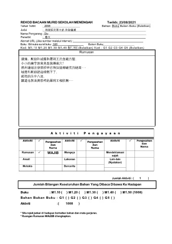 REKOD BACAAN MURID SEKOLAH MENENGAH Tarikh: 23/08/2021