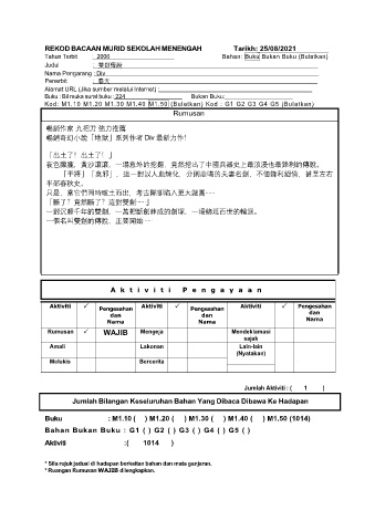 REKOD BACAAN MURID SEKOLAH MENENGAH Tarikh: 25/08/2021
